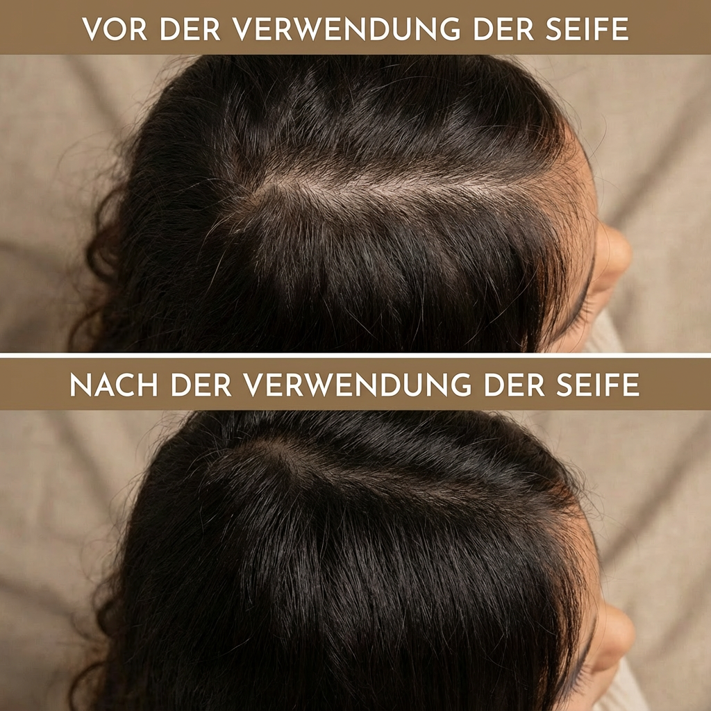 „Endlich eine feste Seife, die wirklich funktioniert. Meine Kopfhaut ist ausgeglichener und die Haare sehen voller aus."