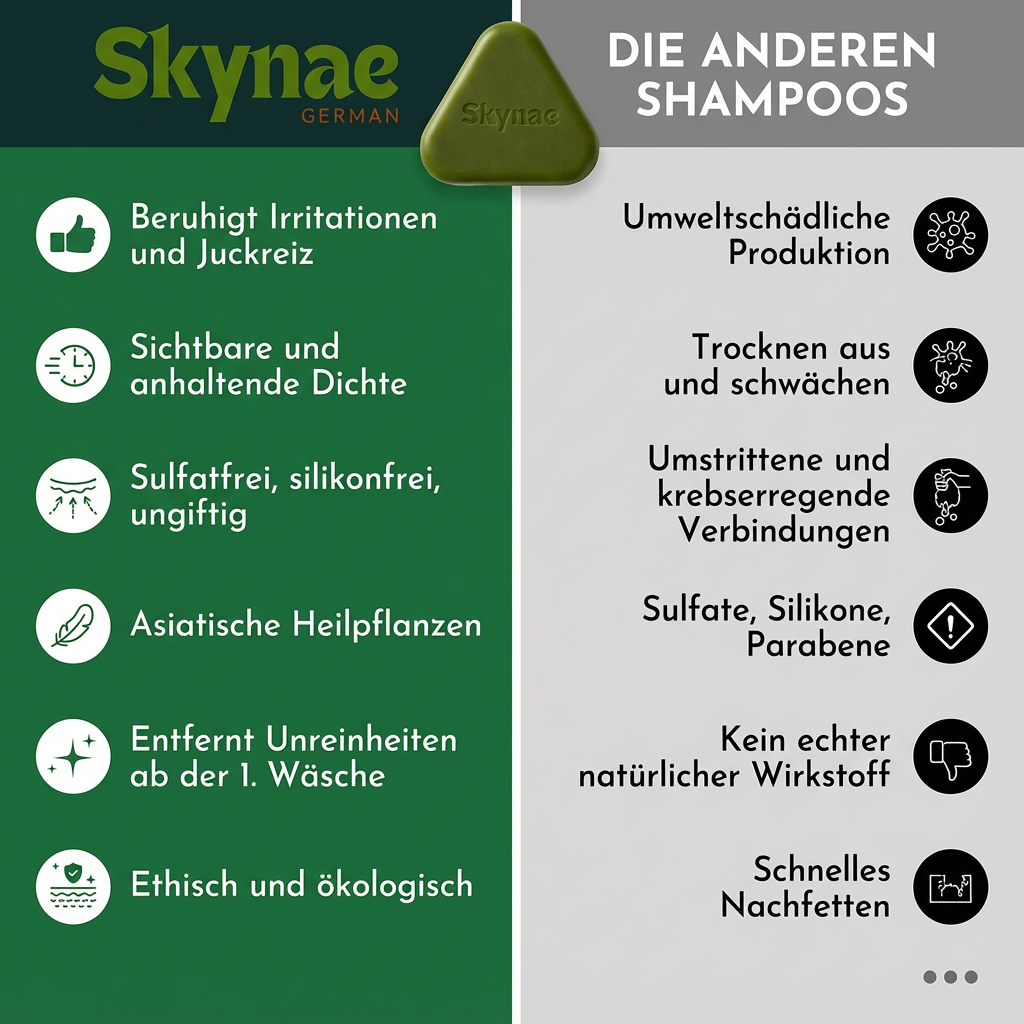 Skynae ist ein konzentriertes festes Shampoo, das mit natürlichen botanischen Extrakten formuliert ist. Im Gegensatz zu herkömmlichen Shampoos enthält es keine Sulfate, Silikone oder schädliche Chemikalien. Unsere Formel konzentriert sich auf die Gesundheit der Kopfhaut und fördert das natürliche Haarwachstum.
